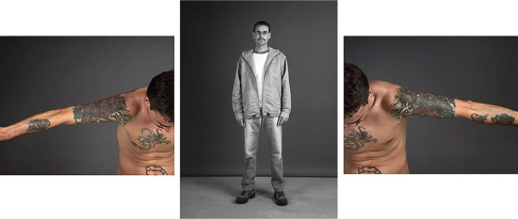 A triptych of each subject's creation is presented in photographic form. The central image is in black and white and depicts the subject as they might be encountered in real life. The two side panels are in colour and focus on the intimacy of the body. As the series progresses, the anonymity of the subjects gradually disappears, and the mystery of their identities becomes more apparent.
