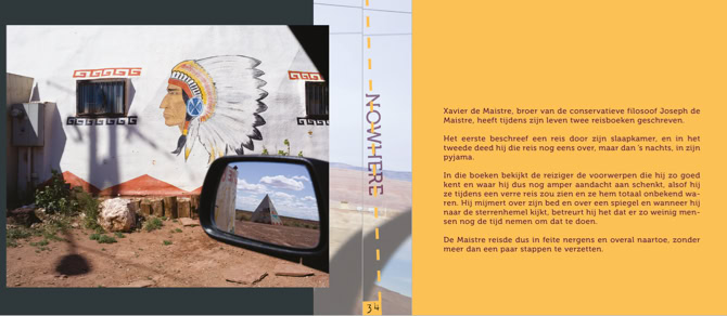 However, Theo Derksen chooses to show his photographs purely as a result of the route he has traveled. No more and no less. He brings the images together in a leporello. Originally a zigzag folded book, for the exhibition elaborated into an impressive installation. The photographs shown on it refer to stories. Stories that the viewer can come up with. For example, we are invited to embrace story telling using the photos shown as a dynamic way of being on the go. Let us be surprised by what we encounter without being immediately on the road. Under the motto Approaching Nowhere we capture images and tell stories
