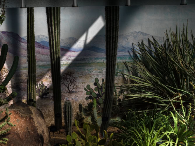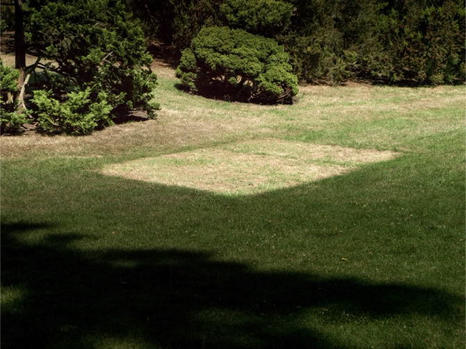 For van Hoef, that is the fascination for metamorphosis, the slow, sometimes sudden, transformation of a place. He named the exhibition and catalog of 2003 Genius Loci, the spirit or nature of the place: it is true that things can change at or in one place, but there remains a certain kind of presence. Shadows often appear in his paintings, which, if you look at them, give the impression of the moment and at the same time suggest a standstill of time, the time is frozen in it or solidifies. But shadows do not stand still, they are on the contrary very temporary, shadows literally change within a minute. The gardens, the fragments or the cut-outs of a built-up environment or a landscape, all of them frozen are at least silent, almost immobile. The experience of time or its absence is his theme.