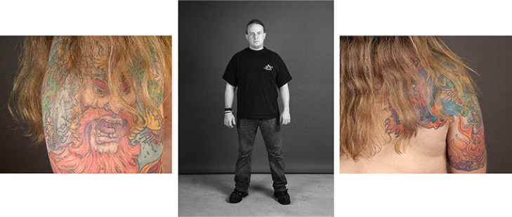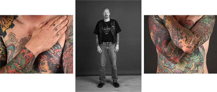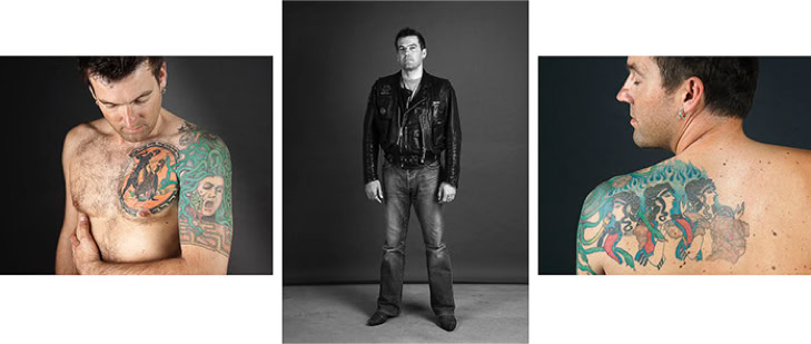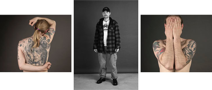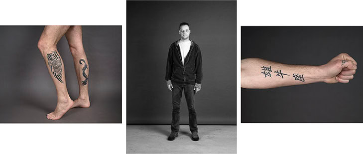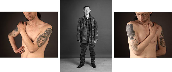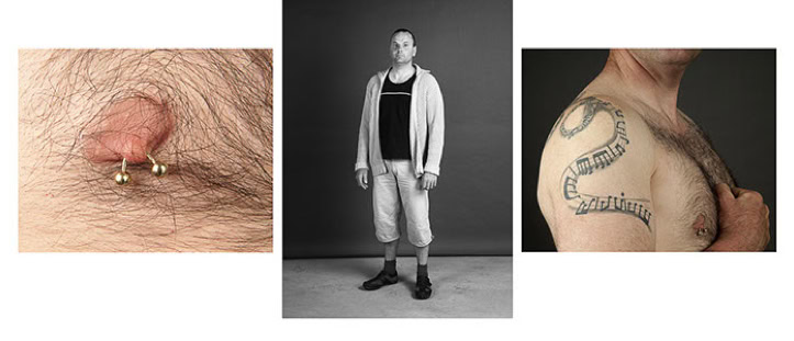A triptych of each subject's creation is presented in photographic form. The central image is in black and white and depicts the subject as they might be encountered in real life. The two side panels are in colour and focus on the intimacy of the body. As the series progresses, the anonymity of the subjects gradually disappears, and the mystery of their identities becomes more apparent.