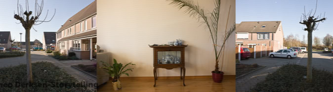Theo Derksen uses a number of image strategies in a subtle but efficient manner that regularly recur in his work. He uses formal structures that build a relational field of tension between iconographic elements that initially seem to coincidentally coincide. Usually these structures can be understood as a form of juxtaposition. What almost inevitably suggests equality and simultaneity. And consequently also: reversibility. Mutual involvement, without hierarchical coercion or order. The photographs by Theo Derksen seldom have a single, centrally placed motif. On the contrary, the attention is drawn between front and back, characters and decor, left and right, top and bottom, light and dark, open and closed spaces.