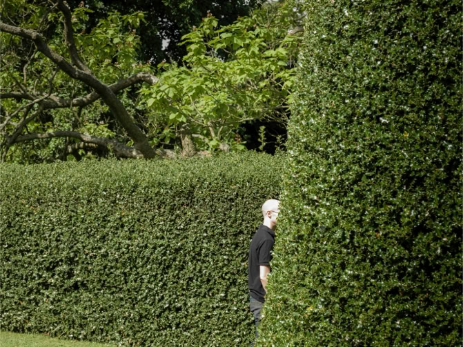 For van Hoef, that is the fascination for metamorphosis, the slow, sometimes sudden, transformation of a place. He named the exhibition and catalog of 2003 Genius Loci, the spirit or nature of the place: it is true that things can change at or in one place, but there remains a certain kind of presence. Shadows often appear in his paintings, which, if you look at them, give the impression of the moment and at the same time suggest a standstill of time, the time is frozen in it or solidifies. But shadows do not stand still, they are on the contrary very temporary, shadows literally change within a minute. The gardens, the fragments or the cut-outs of a built-up environment or a landscape, all of them frozen are at least silent, almost immobile. The experience of time or its absence is his theme.
